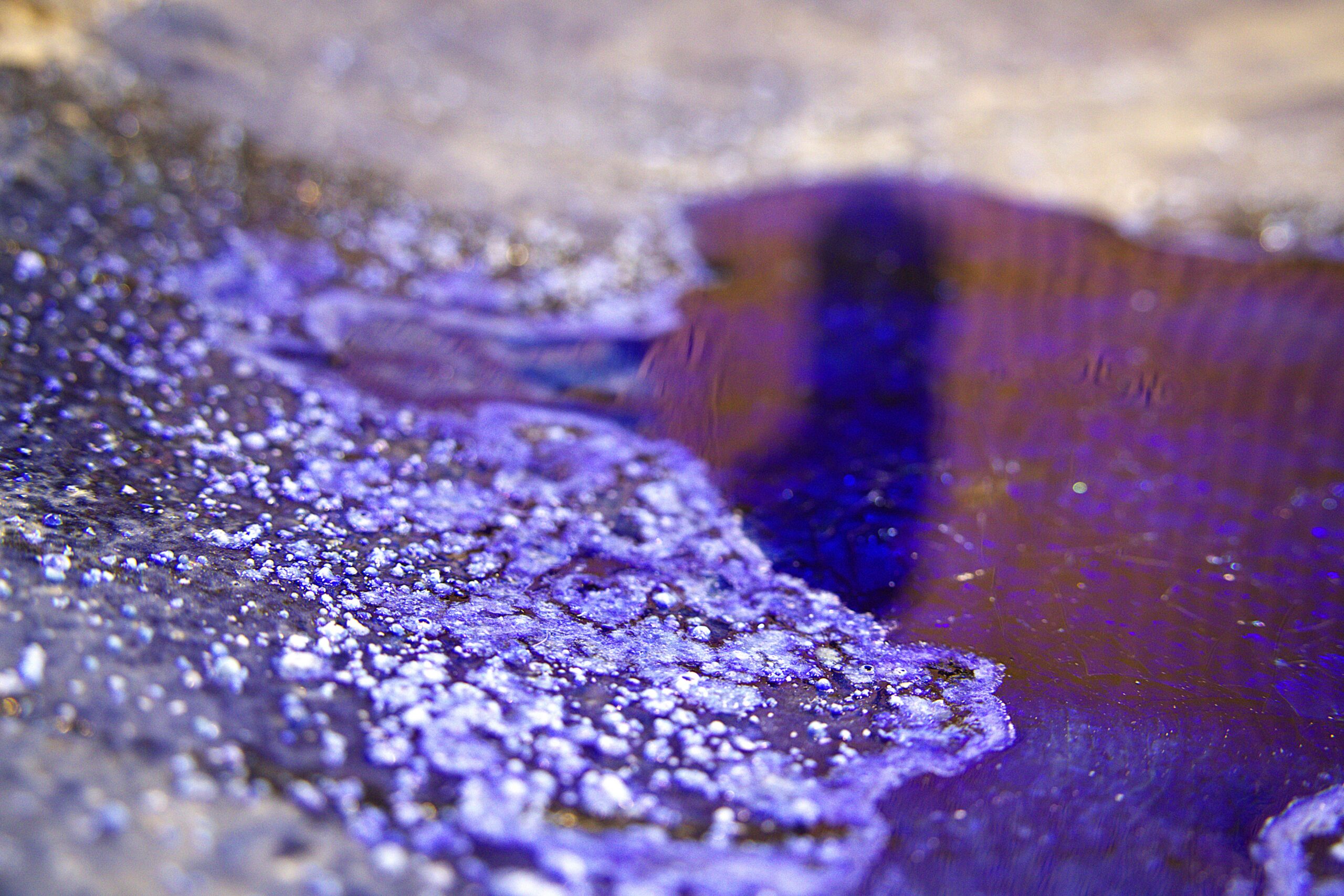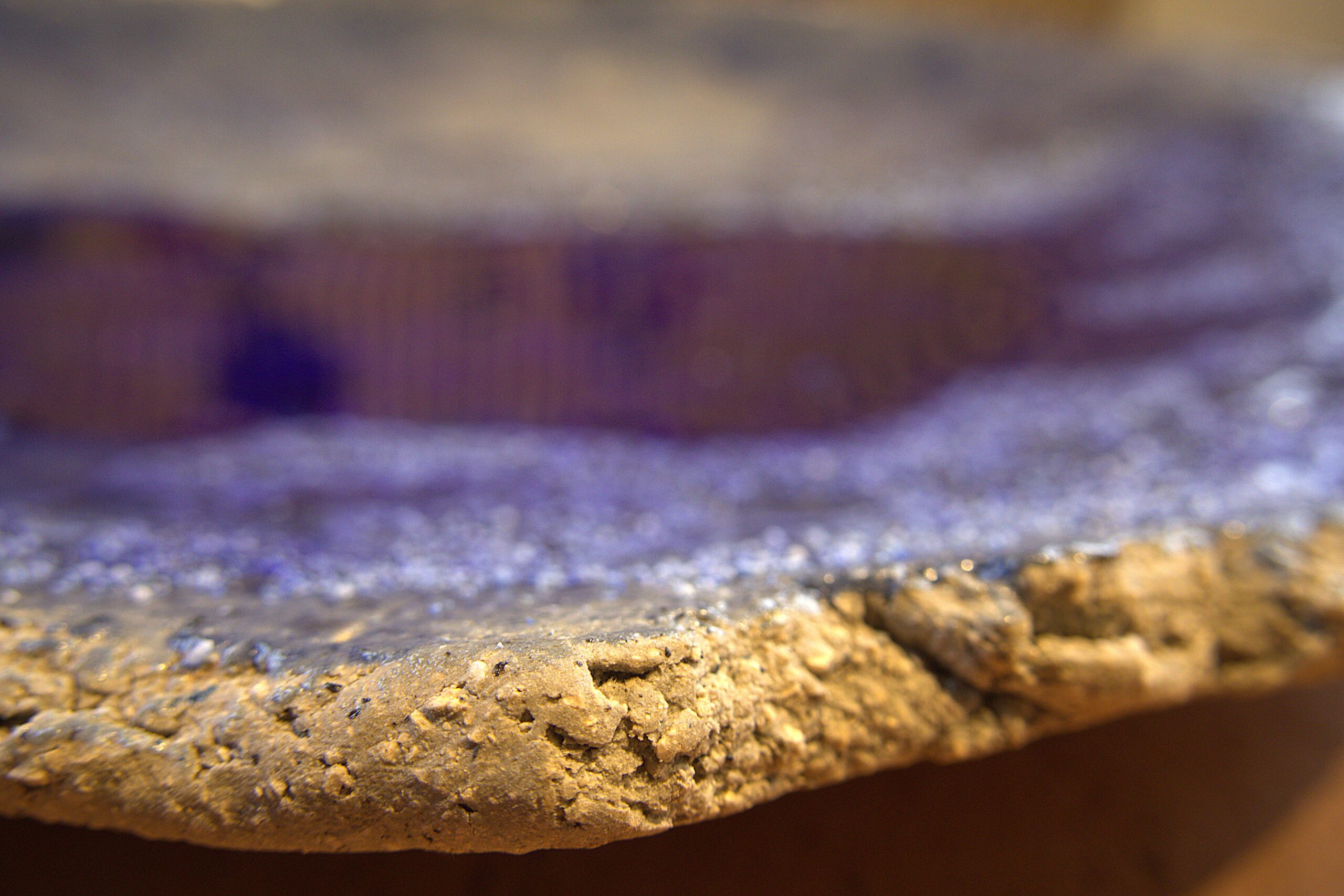 Deze handgebouwde keramische schaal vangt de sfeer van een stille, donkere getijdenpool langs de kust. De robuuste, grillige rand en de natuurlijke, steenachtige structuur vormen een krachtig contrast met het diepe blauw-paars glazuur dat zich als vloeibaar water in het centrum verzamelt.