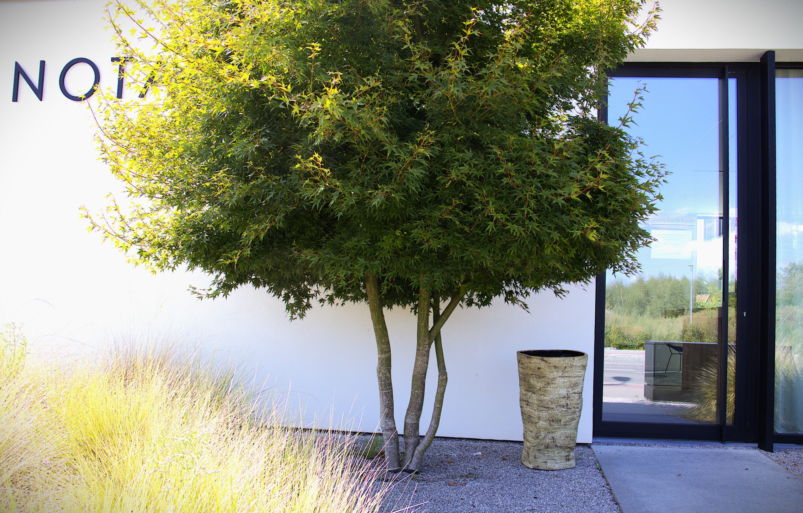 Als solostuk op de vloer creƫert het een sculpturaal accent; gecombineerd met grassen, takken of een groot boeket krijgt het nog meer diepte.